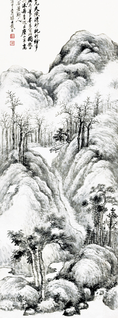 一八四八年,戴熙畫一立軸〈翠幹丹崖圖〉,右下方鈐有「習苦齋」印。這是戴熙中年風格成熟時期的一件作品,屬雄闊一路。全幅山石飽滿,皴法乾淨俐落。點苔林木循S形山勢而上,山腰間的樹林烘托了主峰,墨色沉厚,有「雲中山頂,四面峻厚」之意。