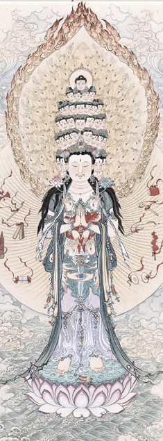 一九四九年,政局變易,時局詭譎。當時有不少專業人士渡海播遷赴臺,其中溥儒、黃君璧、張大千三人雖於生平背景各有不同,但均在畫壇馳名甚早,藝事各有精專,稱為「渡海三家」。他們自傳統筆墨的基礎上發展,面對時代流變,各自演變出不同的創作風格。在他們的作品中,也有不少觀音的形象,可看出藝術家透過寫經、畫像等藝術形式,展現出特定的精神寄託。而張大千與兄張善孖共同創立的「大風堂」,弟子與再傳弟子群體一棒傳一棒,形成近代中國畫史上少見的師承體系。這一脈畫家兼具傳統筆墨功底與開放視野,更成為廿世紀中國畫從古典向現代轉型的重要橋樑。