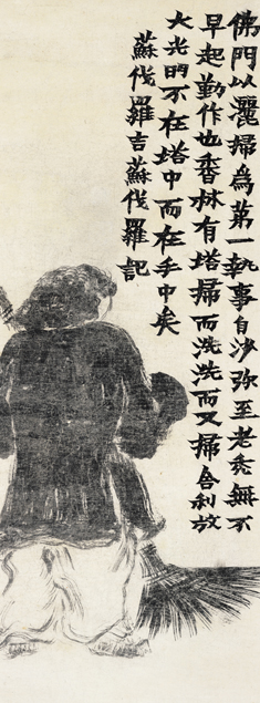 一九三四年,為子女求學便利,何澄於北平購宅修造「真山園」。在園內女兒們使用的二進客廳中,特意懸掛金農〈香林掃塔圖〉,繪一小沙彌背面持帚作掃地狀,以極禿之筆掃成,放縱簡約、墨氣濃鬱、粗獷內蘊,畫上漆書題曰:「佛門以灑掃為第一執事,自沙弥至老禿,無不早起勤作也。香林有塔,掃而洗,洗而又掃。舍利放大光明,不在塔中而在手中矣」,希望女兒們要向這個小沙彌一般早起勤作,才能有所事成。在兒子們臥室裡,則常更換懸掛書聯,如傅山六言楷書聯:「性定會心自遠,身閒樂事偏多」,錢大昕七言隸書聯:「禹糧堯韭窗有草,孔思周情架上書」,何道生所書七言聯:「儉以處家存古道,富於為學有新功」,黃易七言隸書聯:「天意江山有夙期,人間忠孝相關處」,煥然五言楷書聯:「傳家惟忠孝,尚志在詩書」等,皆在激勵其勤勉修身,提升學養情操。 |