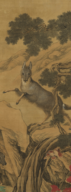 此幅宮廷巨構高逾兩公尺。廿五年(1760)秋,乾隆皇帝特為此圖御製〈青羊詩〉,藉物抒懷。青羊在狩獵中展現的精神與生命力,在皇威之下最終屈服,如同中亞領袖霍集斯的歸降於大清的浩蕩皇威。乾隆藉此詩畫,寓意鞏固邊疆,彰顯其十全武功。