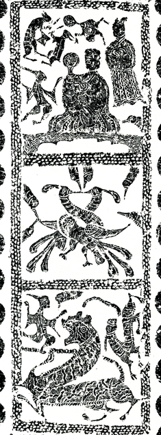 我們可以再往前追溯漢代與月有關的圖像。江蘇徐州銅山苗山漢墓出土畫像石〈炎帝升仙圖〉中,圓月中蟾蜍在下,呈仰視狀,扁頭,圓眼,鼓腹,四肢伸展,背部瘰粒明顯;奔兔在上,呈側視狀,圓頭,長耳,四肢奔騰。漢瓦中也有「蟾蜍玉兔紋」,比如在漢代甘泉宮的遺址中就發現有「蟾蜍玉兔紋」瓦當,以圓形的瓦當象徵著太陰月亮。蟾與兔的身邊有雲氣環繞。瓦當輪邊為連珠紋。還有著名的馬王堆漢墓帛畫,在T形帛畫頂部的左上方太陽內有金烏,右上方為口吐雲氣、足踏新月的巨蟾,其上方還有一隻體型較小的奔兔。