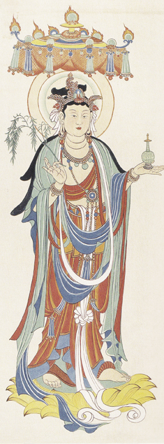 在抵達敦煌之前,張大千的色彩觀念基本植根於文人畫體系。無論是水墨寫意,還是淺絳山水,色彩大多處於從屬地位,講究「隨類賦彩」與雅淡調和,以不掩墨韻為旨歸。敦煌石窟則為他打開了一個截然不同的、輝煌燦爛的色彩宇宙。敦煌壁畫大量使用石青、石綠、朱砂、赭石、鉛白等礦物顏料,並輔以瀝粉貼金工藝。這些色彩飽和度高,性質穩定,歷經千年仍絢爛奪目。它們不僅用於「隨類賦彩」,更具備獨立的象徵意義,如金色即代表佛國光輝,並具備強大的情感表現力與裝飾美感。張大千深入臨摹的過程,也系統性地研究古代礦物顏料製作、疊加、勾填技法等,並領悟出色彩本身可以成為畫面的主導力量,能直接營造氛圍、傳達情緒、建構神聖空間,這也深刻影響了他敦煌歸來後的創作風貌。人物畫作如〈擁髻美人圖〉,設色濃麗大膽,朱砂、石綠、白粉對比鮮明,一掃明清仕女畫的柔靡淡雅,撲面而來的是盛唐仕女的華貴與健康。這幅畫的背景和人物關係的安排,仍保留他將敦煌經驗融入自身創作的實驗軌跡,然而正是這種不成熟,使其作為印證張大千藝術創新的切片而顯得更為珍貴。在工筆花鳥〈黃水仙圖〉中,他更將敦煌的「描金」技法巧妙化用,以金線勾勒水仙輪廓,在淡雅的基調中注入一抹靜謐的輝煌,拓展了傳統花鳥畫的語言維度。敦煌的色彩經驗,解除了其創作中「重墨輕色」的潛在束縛,為其日後在山水畫中復興青綠傳統,並最終走向潑彩的抽象性色彩表達,埋下了至關重要的伏筆。 |