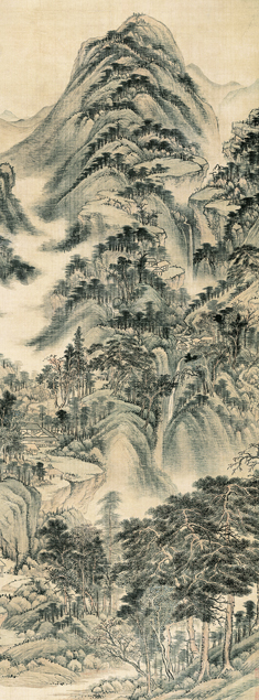 〈南山積翠圖〉左上題識「壬子長夏,寫南山積翠圖」。由畫題可知此圖為王時敏作於清康熙十一年(1672)。王時敏(1592∼1680),字遜之,號煙客,又號西廬老人等,江蘇太倉人。以蔭官至太常寺少卿,是清初「四王」之首,工詩善書,精於繪畫,少時曾得董其昌、陳繼儒的親授,受以筆墨為中心的正統派思想影響,刻意師古,對清初山水畫的影響巨大。〈南山積翠圖〉繪煙靄縈回疊嶂層巒、長松嘉木秀潤蒼然的景致。一道飛瀑自巖壑間奔瀉,山間曲徑蜿蜒連通草亭幽閣。近景松枝勾勒細勁如篆,遠景叢樹橫筆點染,墨色蓊鬱欲滴。溪橋隱現於嵐氣中,尤得空靈杳渺之韻。其筆墨設色與元代黃公望〈天池石壁圖〉一脈相承。〈南山積翠圖〉畫面中營造出宛如仙境般的南山之景,寓意深刻。 |